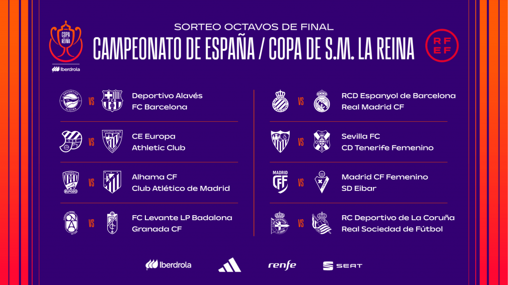 El Salón Luis Aragonés de Las Rozas ha sido escenario del sorteo de los octavos de final de la Copa de la Reina. En esta ronda entraron en acción los clubes que ocuparon los ocho primeros puestos de la Liga F el curso pasado: FC Barcelona, Real Madrid, Atlético de Madrid, Athletic Club, Granada, Costa Adeje Tenerife, Real Sociedad y Eibar, integrantes del bombo 3.