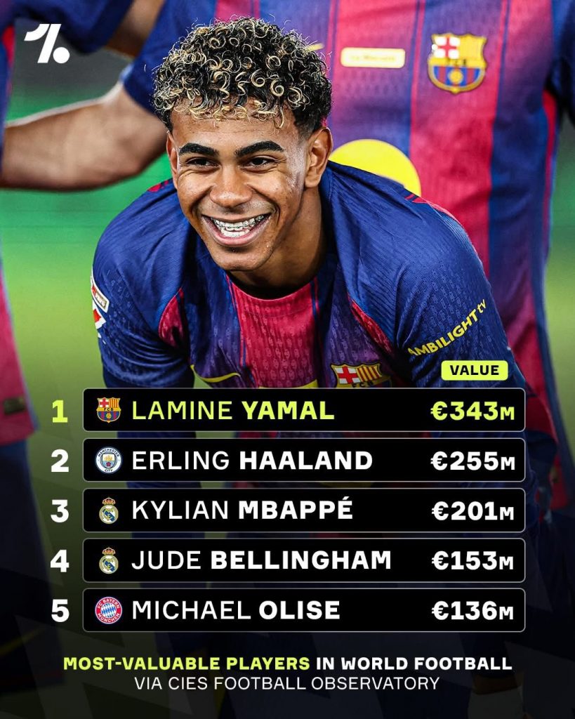 Más allá del reconocimiento individual por su rendimiento en diciembre, Yamal también ha marcado una nueva página histórica a nivel global. El CIES Football Observatory, institución especializada en análisis del fútbol mundial, publicó un informe que sitúa al extremo azulgrana como el jugador más valioso del mundo en términos de mercado.