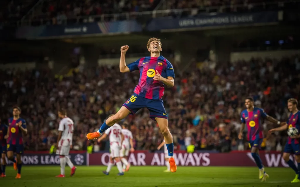 Fermín celebra uno de sus tres goles ante el Olympiacos en Champions