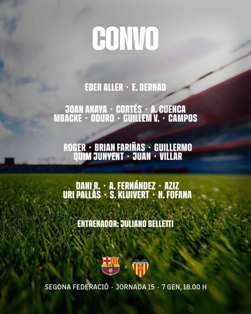 El Barça Atlètic y el Valencia Mestalla se enfrentan en su partido correspondiente a la jornada 15 del grupo 3 de la Segunda RFEF, encuentro aplazado por la imposibilidad de viajar del equipo visitante el día previsto por condiciones climatológicas adversas.