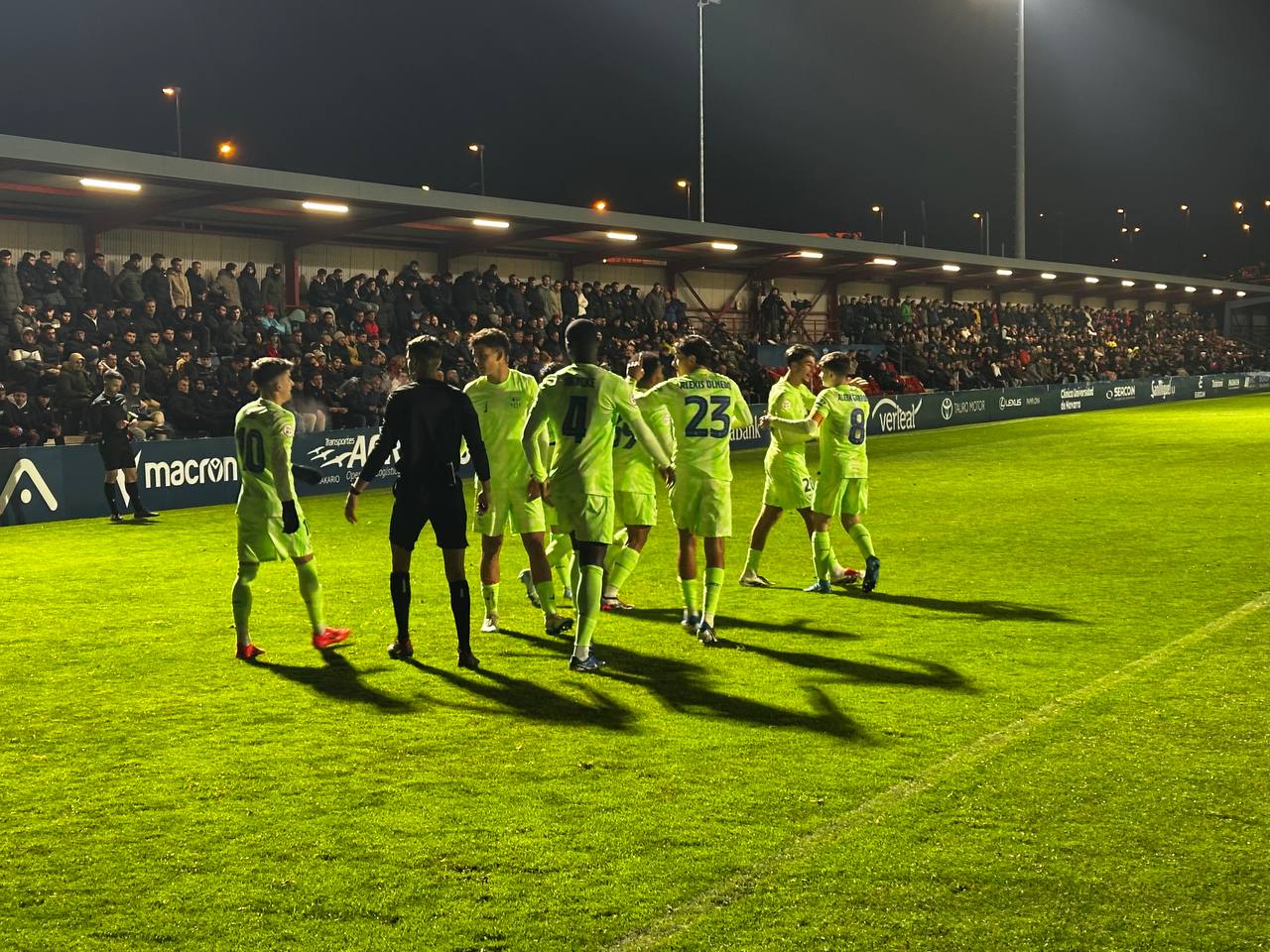 Pero ya el susto estaba por parte de los blaugranas que se empezaban a meter más en el partido. En eso, una recuperación de Dacosta a velocidad termina en una pared con Unai que no duda en devolvérselo. Pero este le pega buscando el segundo palo pero el portero Valencia lo desvía pero para llega a los pies de Guille que no duda en pegarle con fuerza para empatar el partido (min 40′). Después de esto, el partido continuó sin mucha novedades y el árbitro no dudaba y marcaba el final de esta primera mitad.