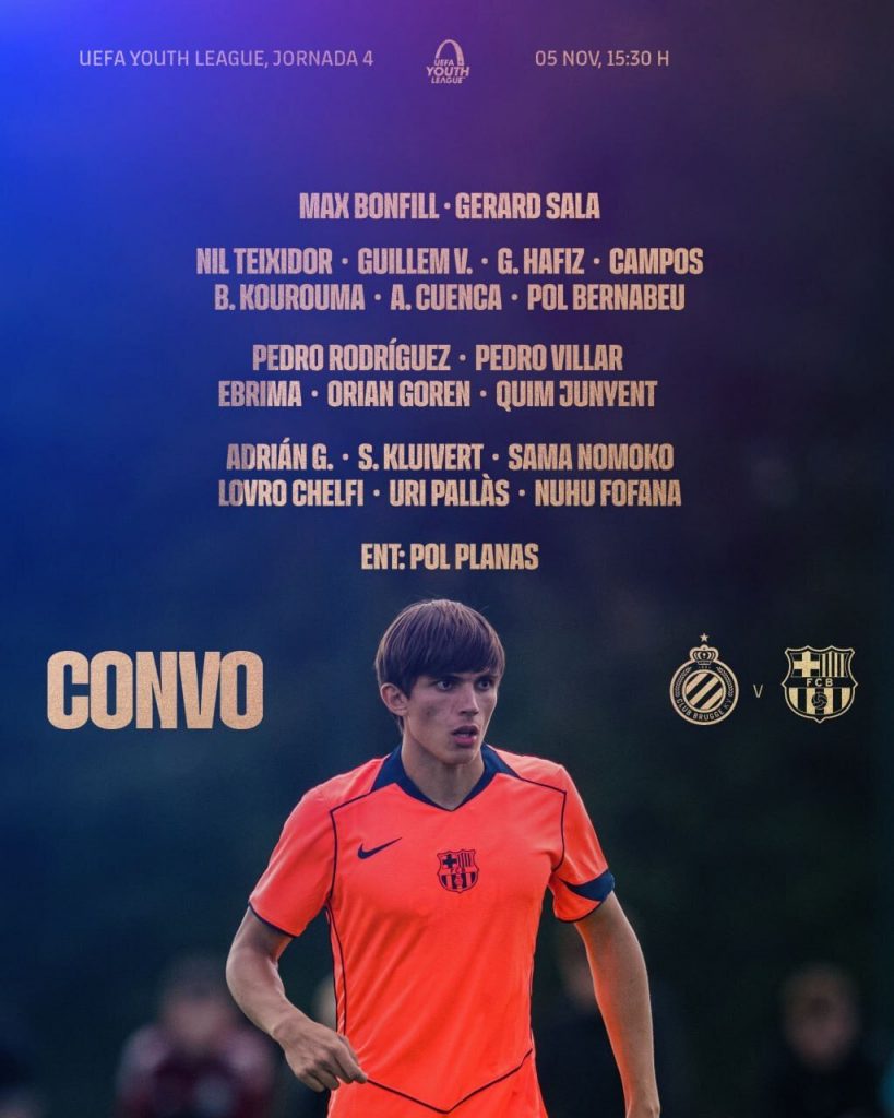El Juvenil A de Pol Planas afronta otro reto europeo teniendo por delante otra jornada de la fase liga de la Youth League, esta vez enfrentándose al Club Brujas U19. Viendo la clasificación y el historial de partidos, el encuentro promete ser un gran partido, ya que ambos conjuntos aún no conocen lo que es no ganar en competición europea.